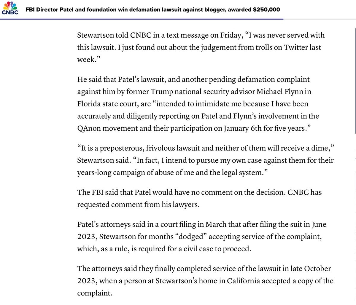 He said that Patel's lawsuit, and another pending defamation complaint against him by former Trump national security advisor Michael Flynn in Florida state court, are “intended to intimidate me because I have been accurately and diligently reporting on Patel and Flynn's involvement in the Anon movement and their participation on January 6th for five years.”