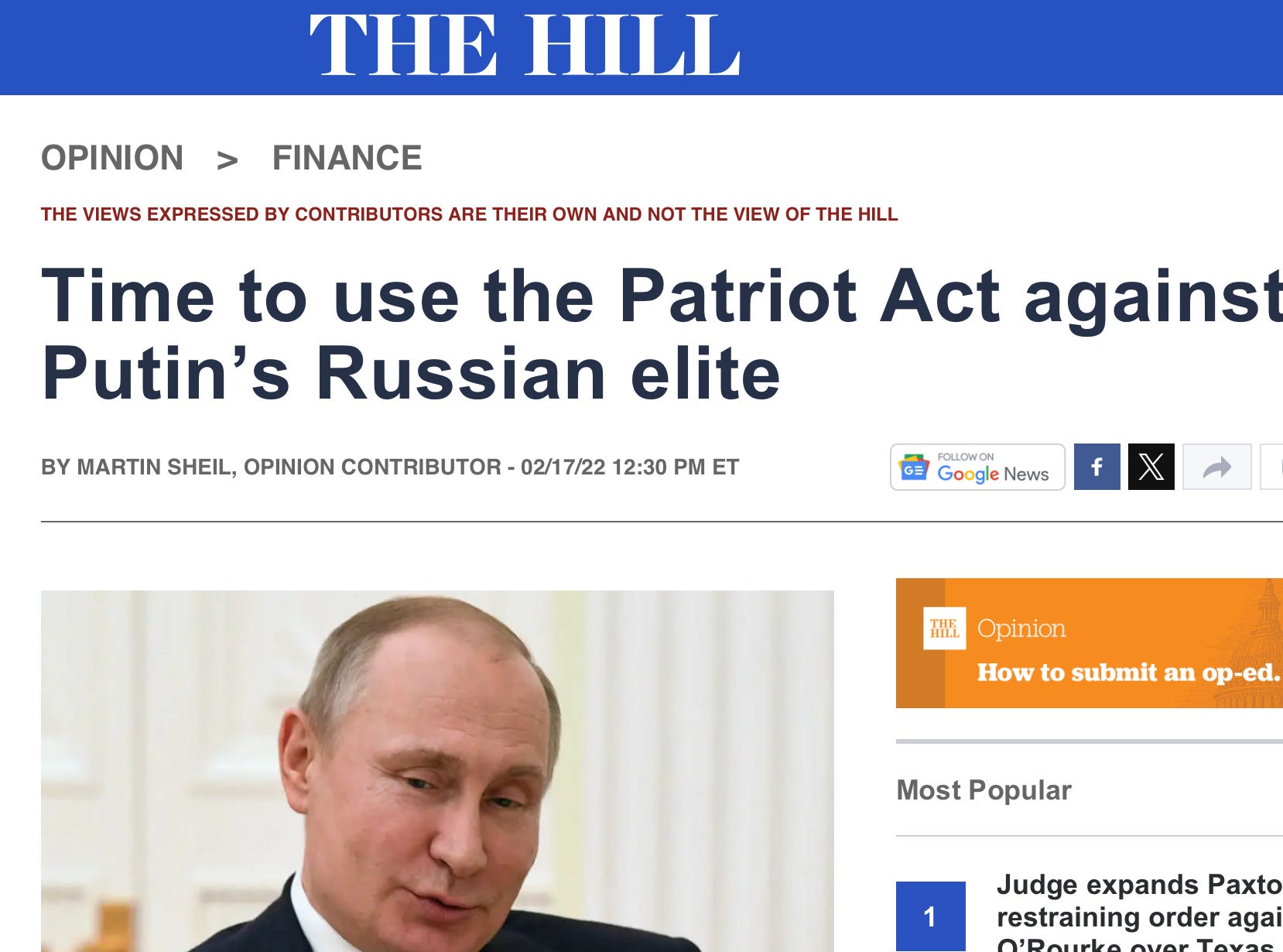 Thank you to all the new, returning, and Founding level members. Now on to Marty’s latest on the Russian mob/government. In my opinion, the Alaska shitshow successfully normalized monsters. Marty has a simple plan on how to hit ‘em where it hurt$.—hsc