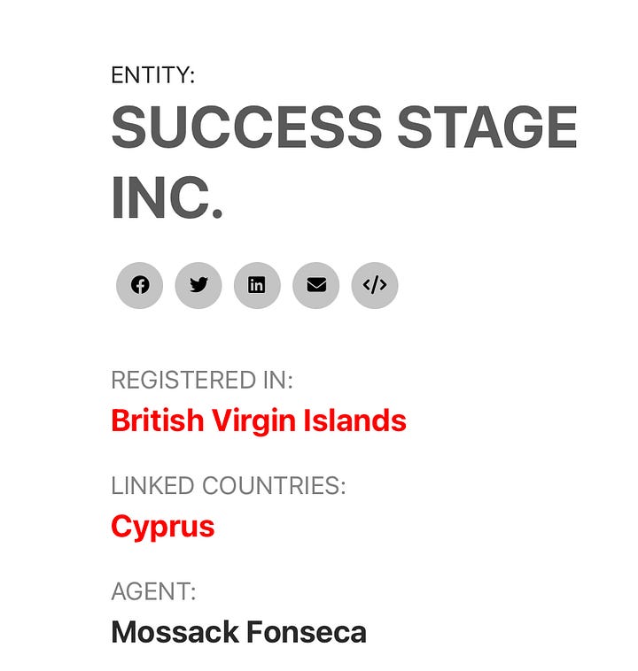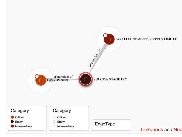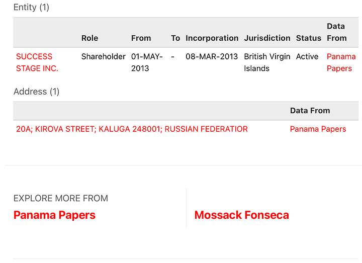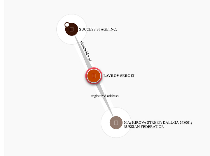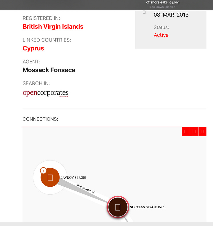 We can see that Lavrov has some things in common with the above listed oligarchs. He is closely associated with a BVI shell company called Success Stage.