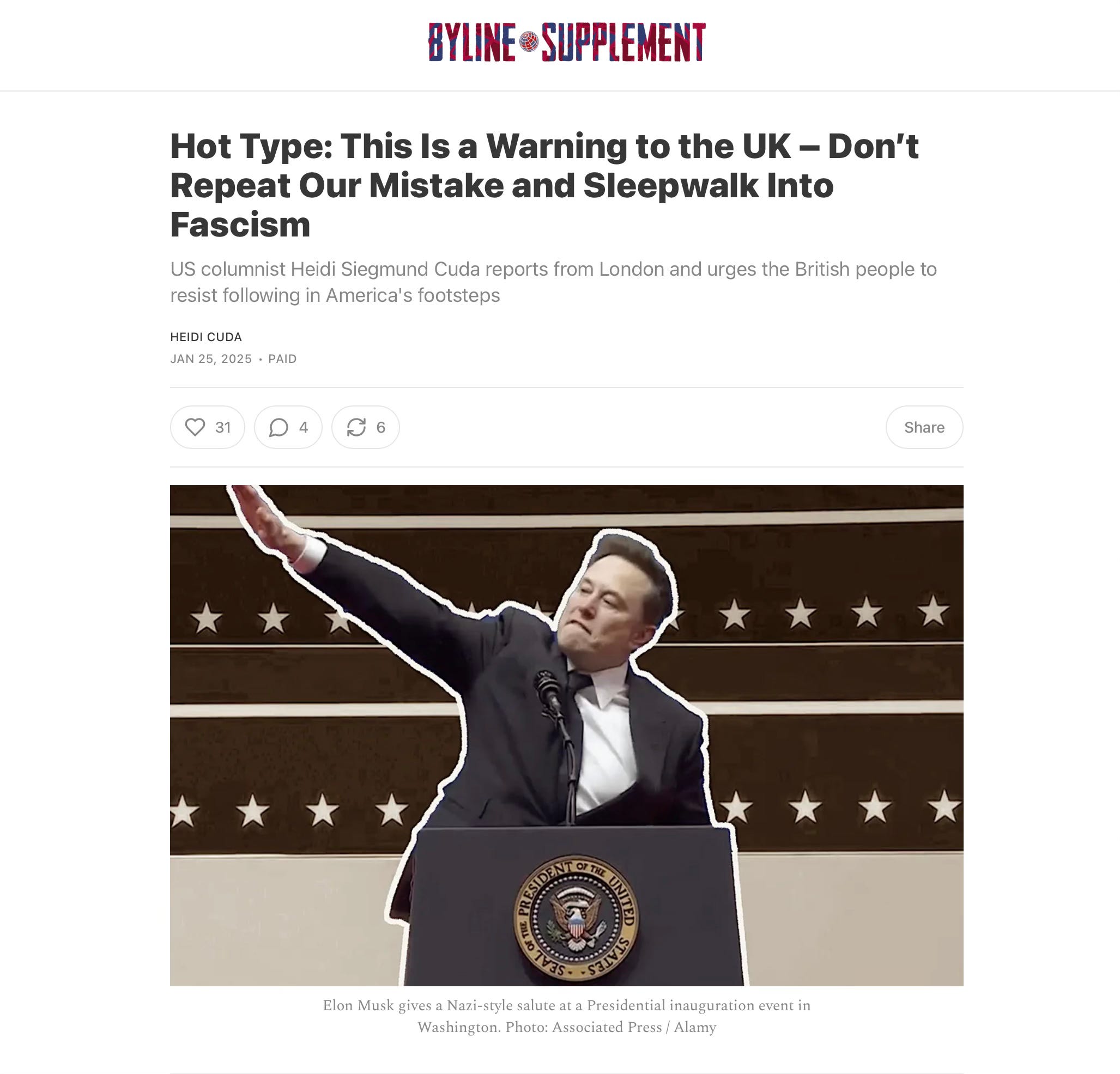 My weekly Hot Type column in Byline Supplement warns people in the UK to not sleepwalk into fascism