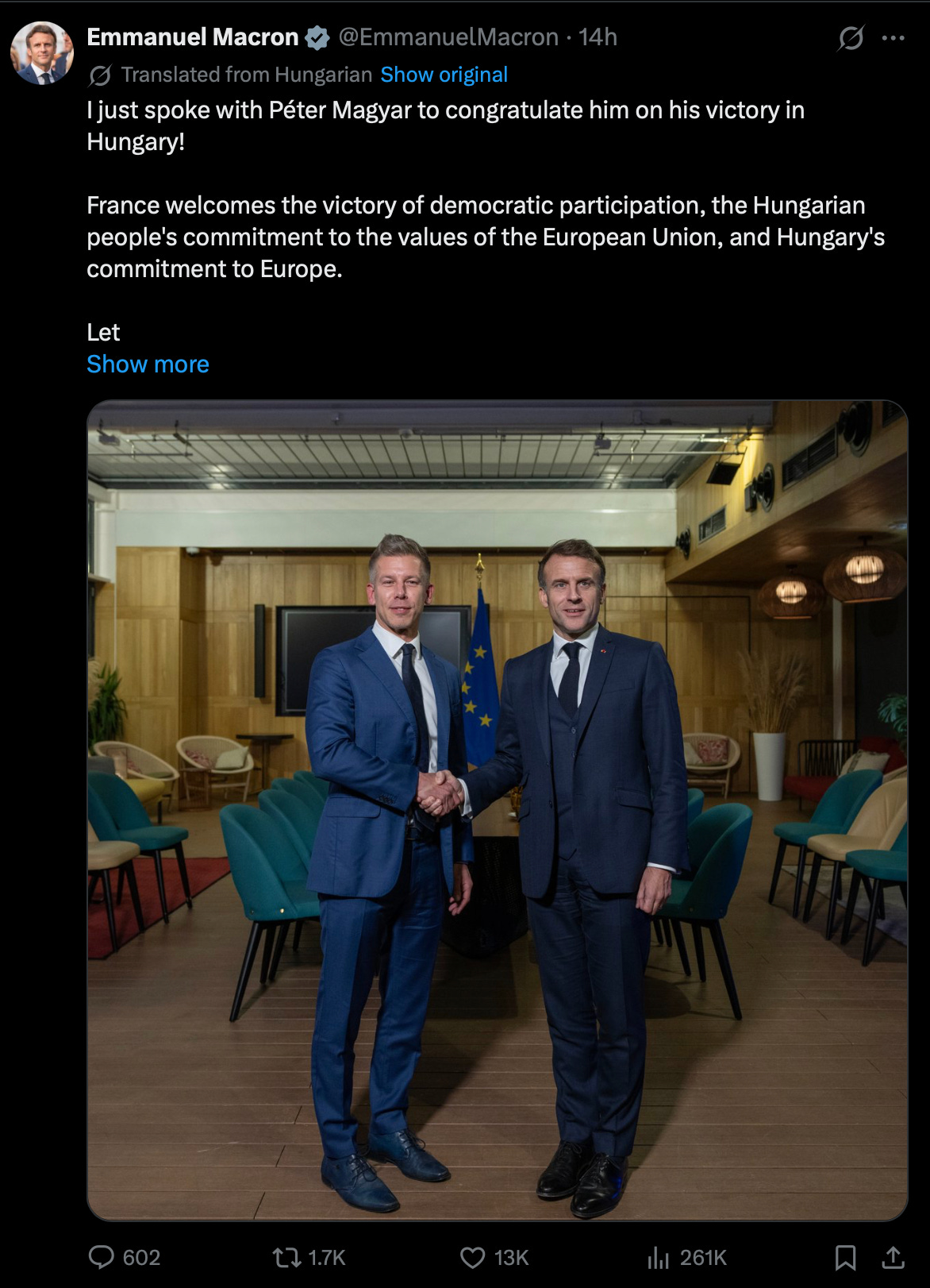 I was, however, happy to see Macron not let any moss grow in offering a hearty FU to Orbán as he welcomed Magyar.