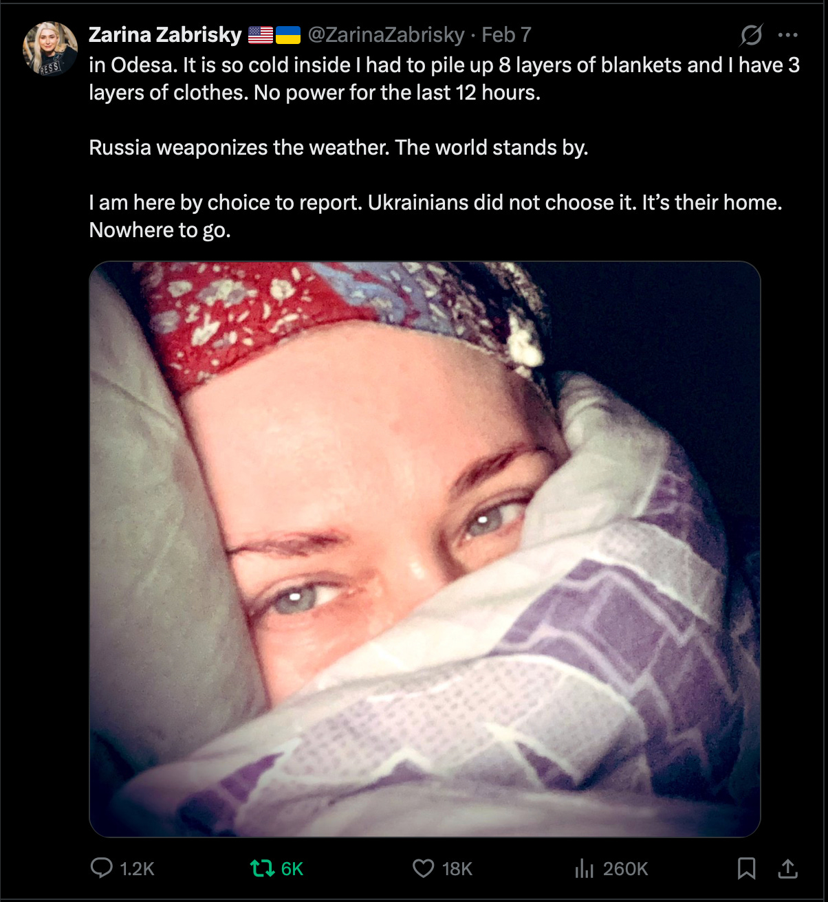 Our guest this week is war correspondent and filmmaker Zarina Zabrisky, who is seen here trying to keep warm under eight blankets and three layers of clothing.