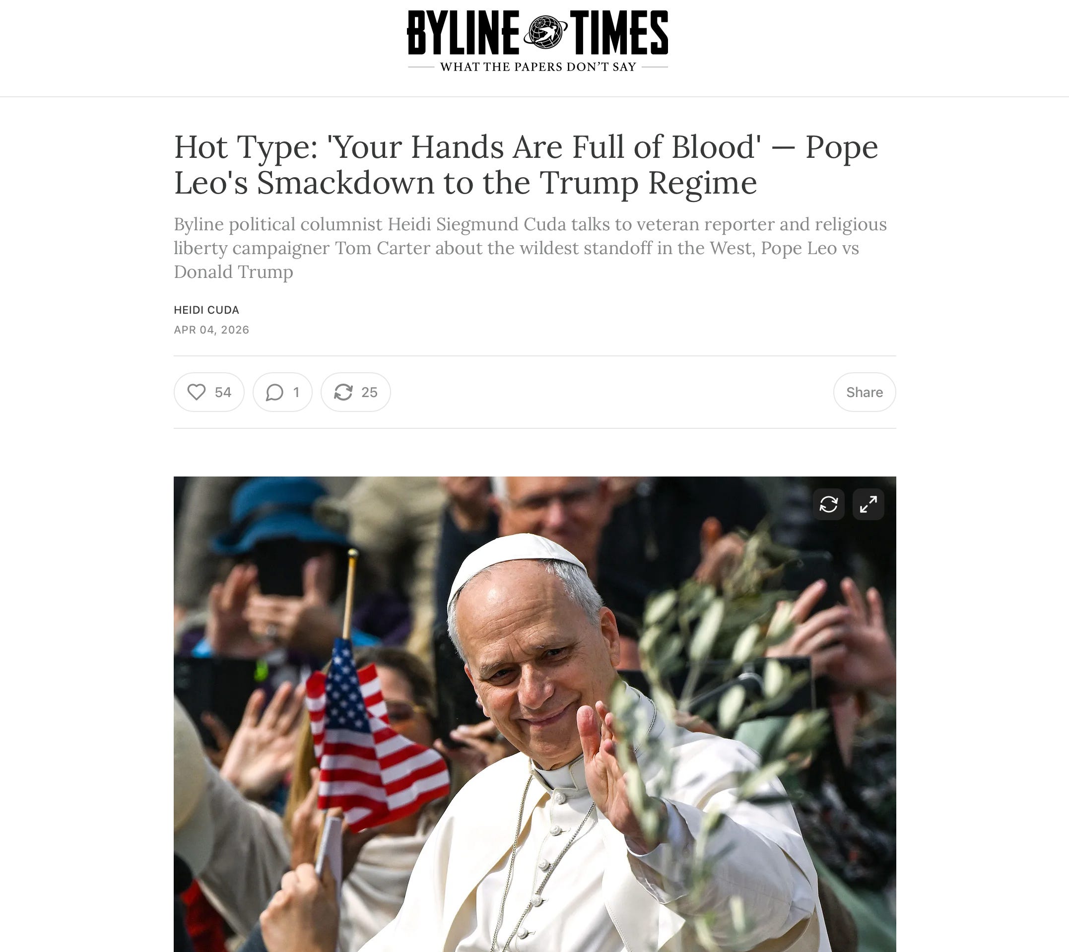 In today's Hot Type column in Byline, I interview veteran reporter and religious liberty campaigner Tom Carter about the wildest standoff in the West, Pope Leo vs Donald Trump