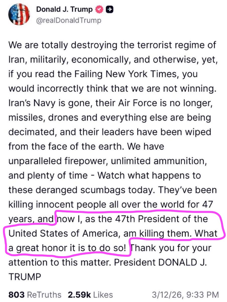 I believe it’s an important investigation into Trump ally Rodrigo Duterte at The Hague. As usual, reports like this get buried — and I feel they matter more than the hot take of pundits responding to the latest torrent of ‘look at me!’ clickbait fascism put out by the Putin and Trump regime. On Twitter, I was unable to post the link to the report with the image of Duterte showing up — further burying my work, which is already deeply suppressed on the platform that used to enable independent investigative reporters to actually be seen and gain a wide global audience. Now, it’s a trickle, which makes your support here so valuable to me. I am reposting the report today because right after I pressed send, I learned two things: that Trump himself posted “killer,” dehumanizing language about Iranians, and that the ICC is now probing dictator Lukashenko of Belarus, which I write more about at the bottom of this report. I want you to look at Trump’s language here and as you read Duterte’s words, I’d like you to compare the two: