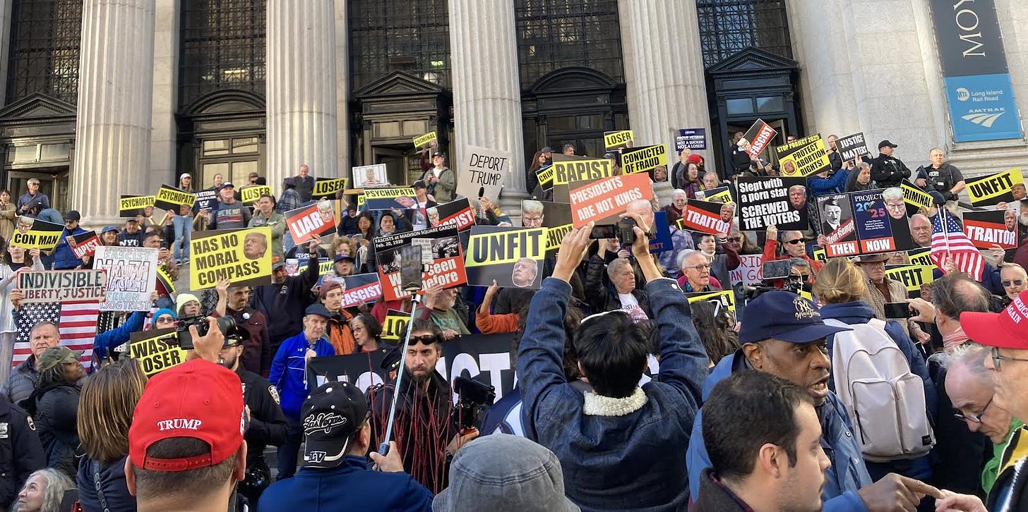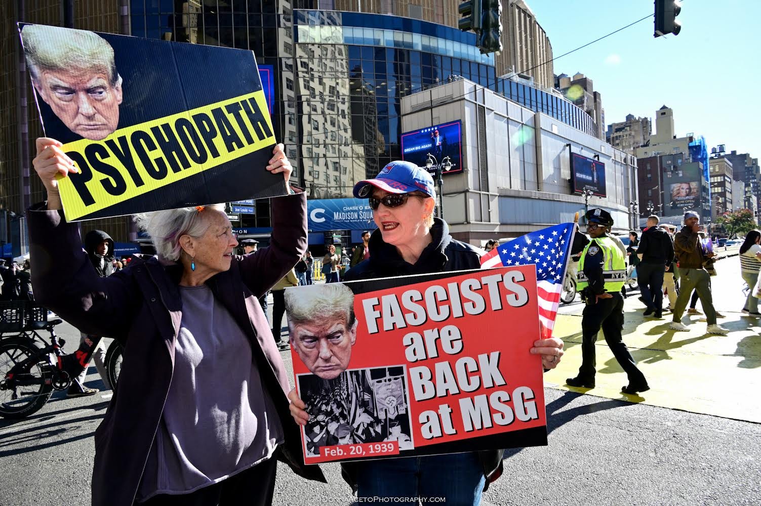 Julie DeLaurier, right, protesting in front of Madison Square Garden, Oct. 27, 2024