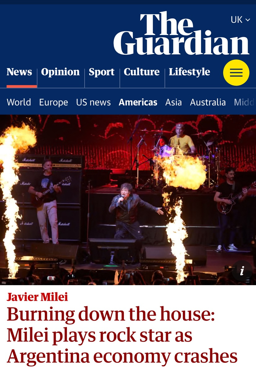 Below, The Guardian report on Milei performing on stage at his book release party.