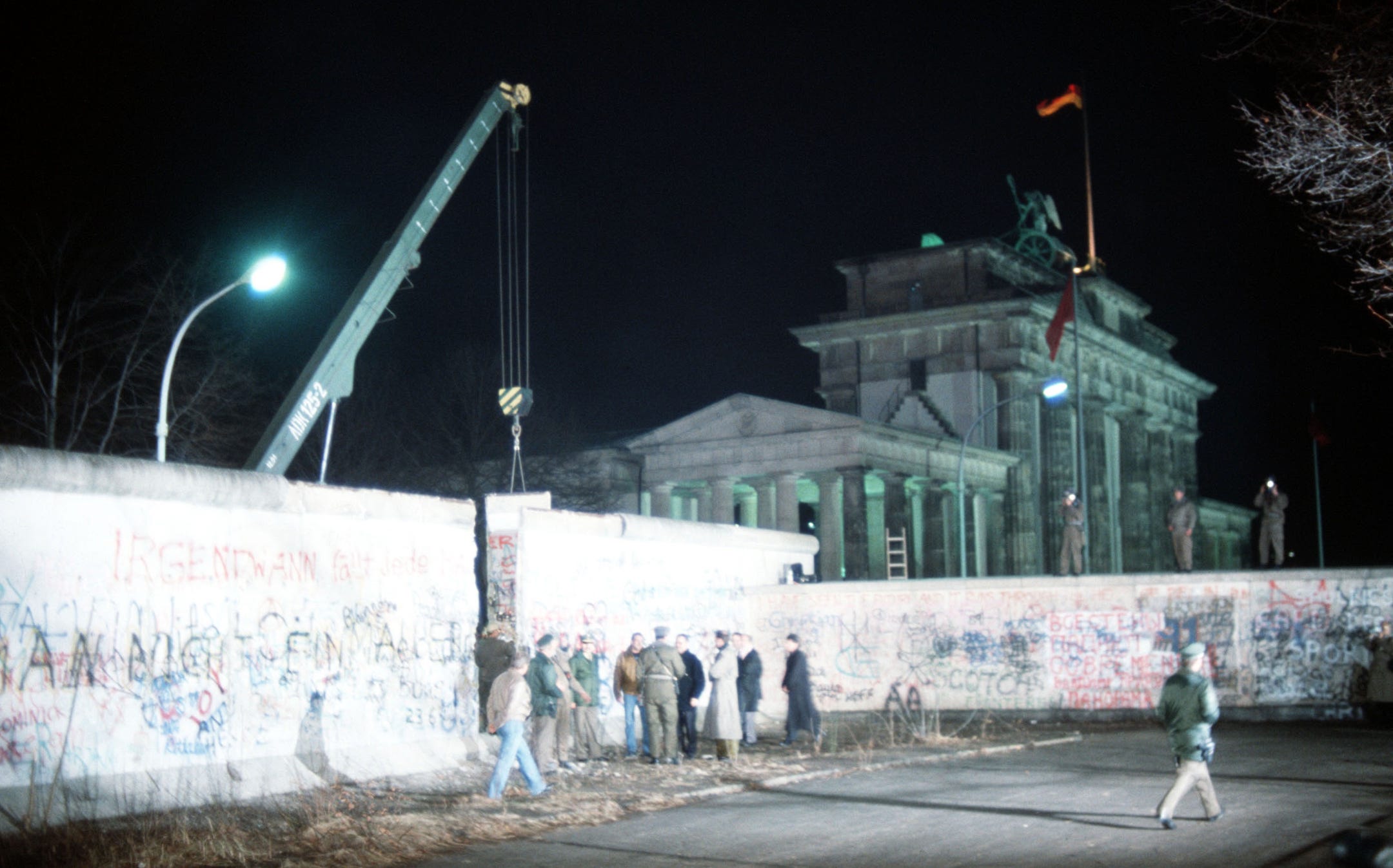 A crane removes a section of the Wall near Brandenburg Gate on 21 December 1989. Image courtesy Wikipedia.