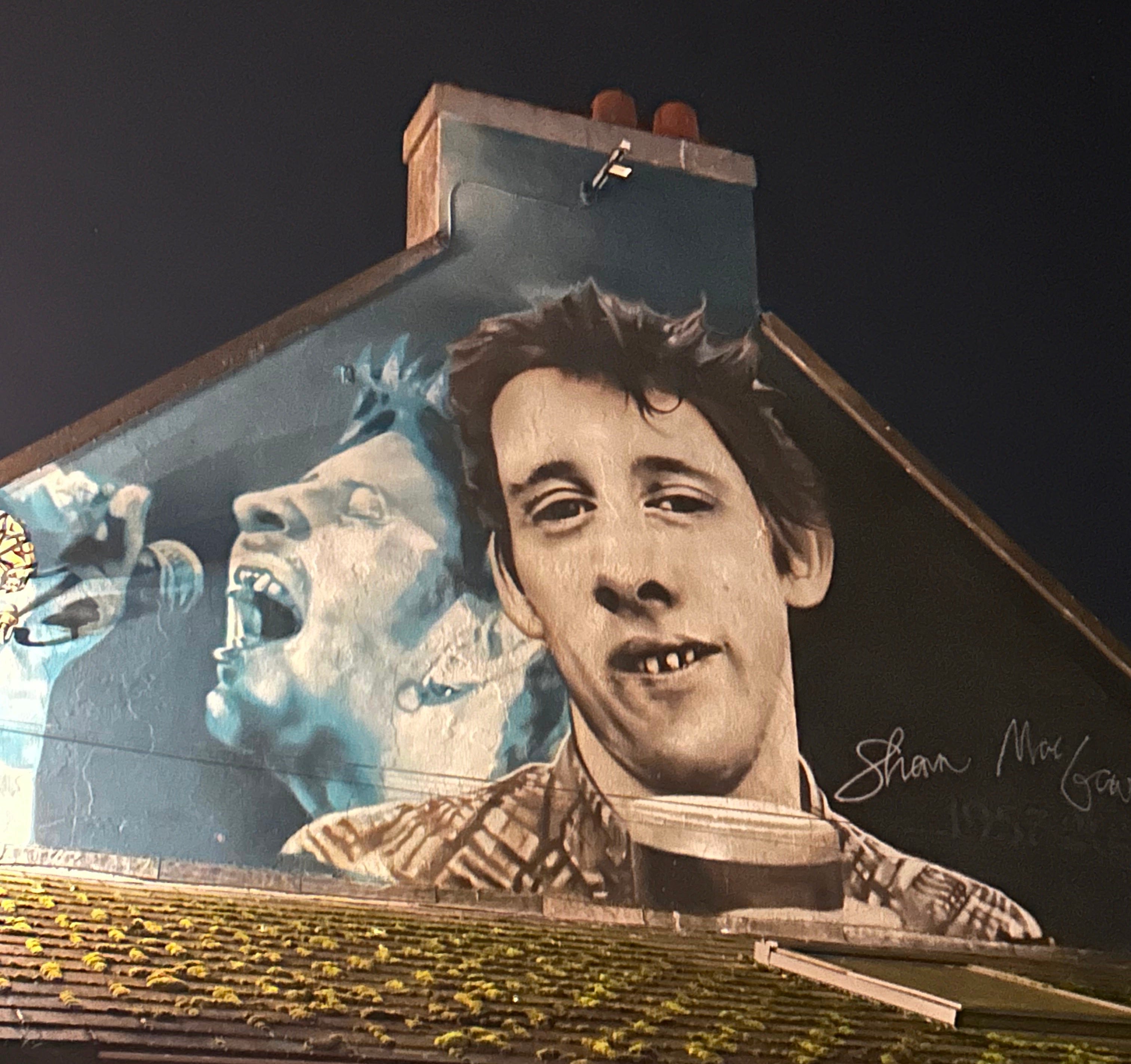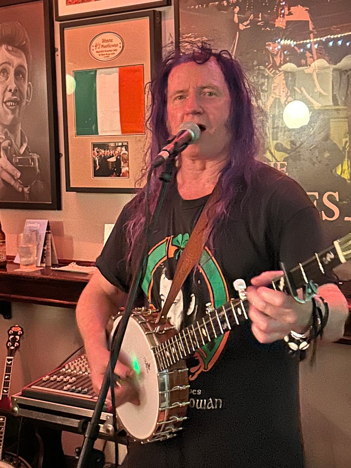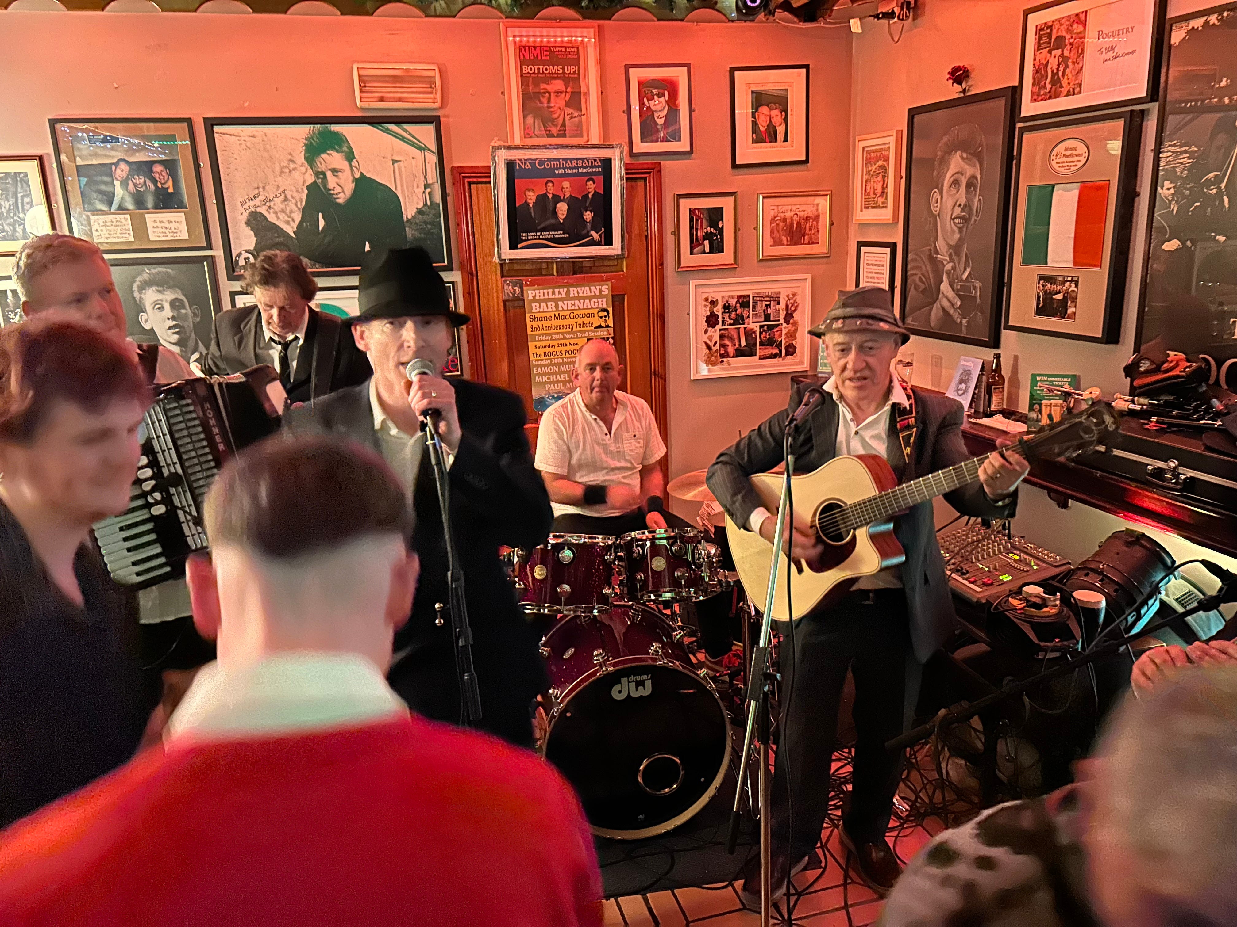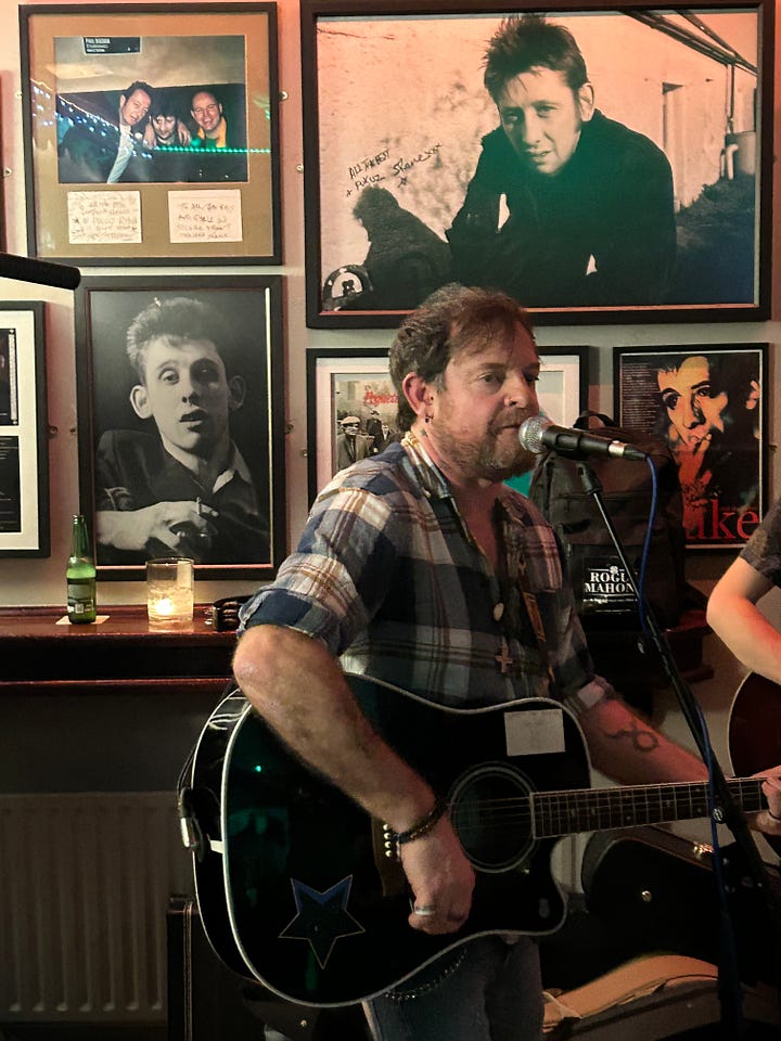 The Hog, whose real name is Michael Casey, invited me to see them perform in Tipperary, at a pub called Philly Ryan’s in a town called Nenagh. The event was the second anniversary of the loss of the great poet Shane MacGowan, whose mother was from Nenagh. The Pogues frontman spent a lot of time at Philly’s, his favorite pub in the area. He became close with the owner, an undertaker named Philip Ryan, who created a makeshift shrine to MacGowan of posters and photographs in the pub’s performance space. There’s even a large mural of MacGowan on the pub’s exterior.