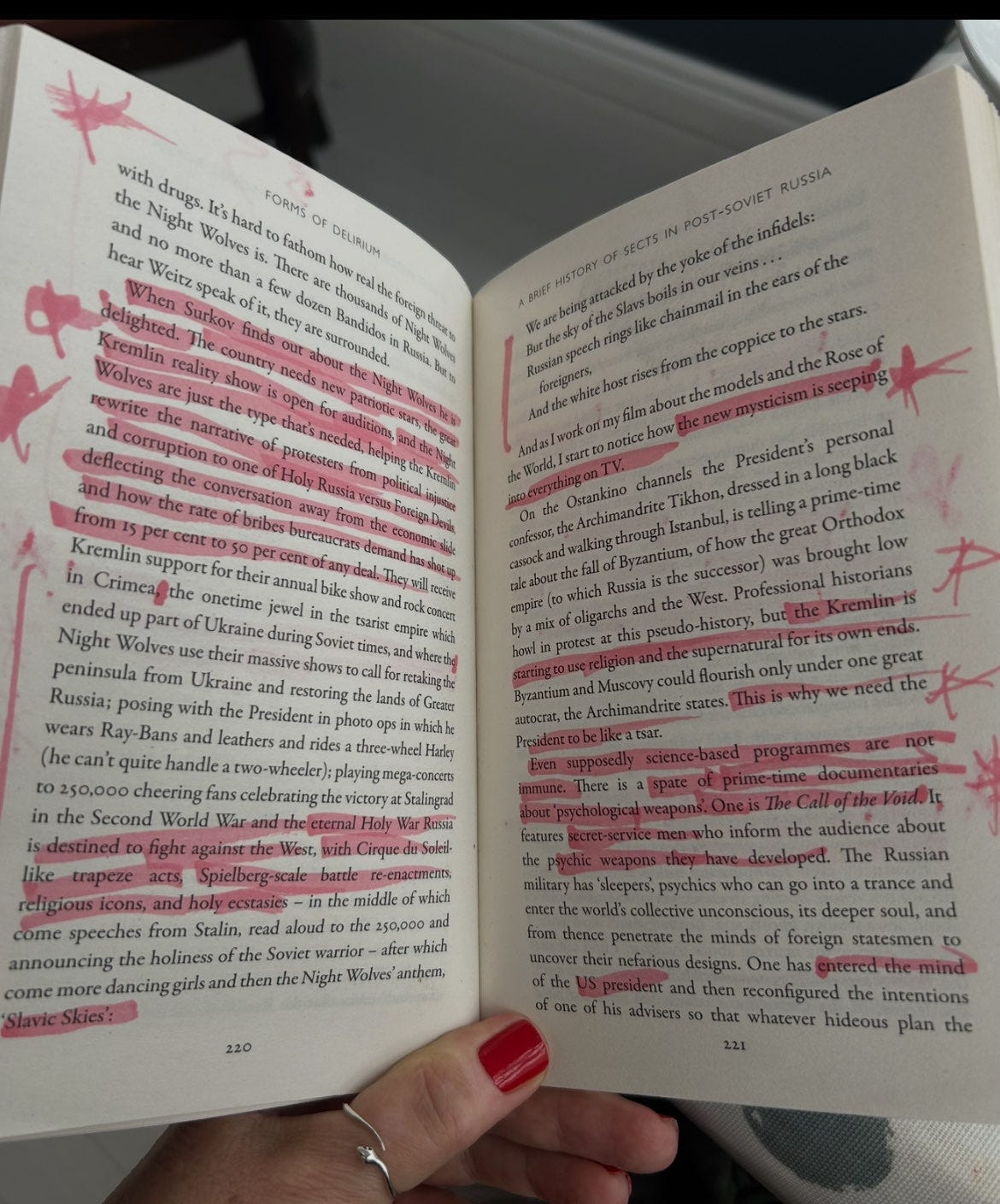 “‘Performance’ was the city’s buzzword,” Pomerantsev writes, “a world where gangsters become artists, gold diggers quote Pushkin, Hells Angels hallucinate themselves as saints. Russia had seen so many worlds flick through in such blistering progression—from communism to perestroika to shock therapy to penury to oligarchy to mafia state to mega-rich—that its new heroes were left with the sense that life is just one glittering masquerade, where every role and any position or belief is mutable… It was only years later that I came to see these endless mutations not as freedom but as forms of delirium, in which scare-puppets and nightmare mystics become convinced they’re almost real and march toward what the President’s vizier would go on to call the ‘the fifth world war, the first non-linear war of all against all.’”