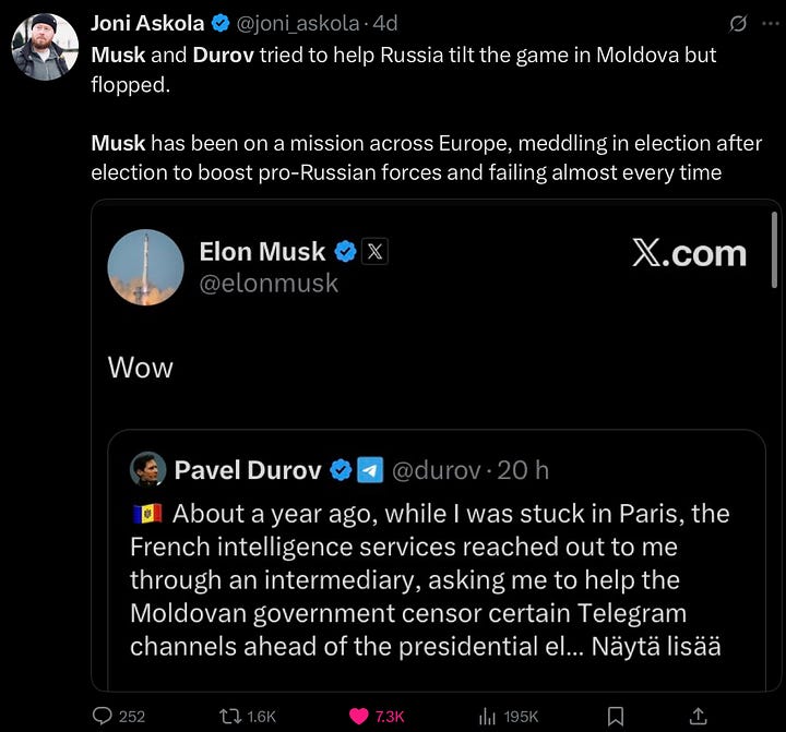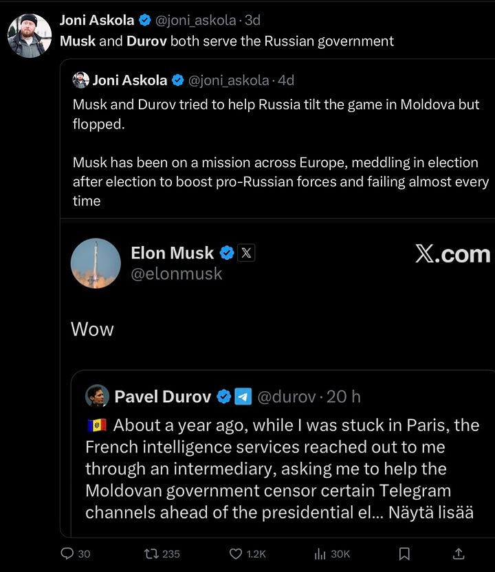 Tuesday, we’ll be discussing one of his latest threads on how Telegram CEO Pavel Durov tried to interfere with Moldova’s recent election, with Elon Musk tag-teaming, and how both of them failed.