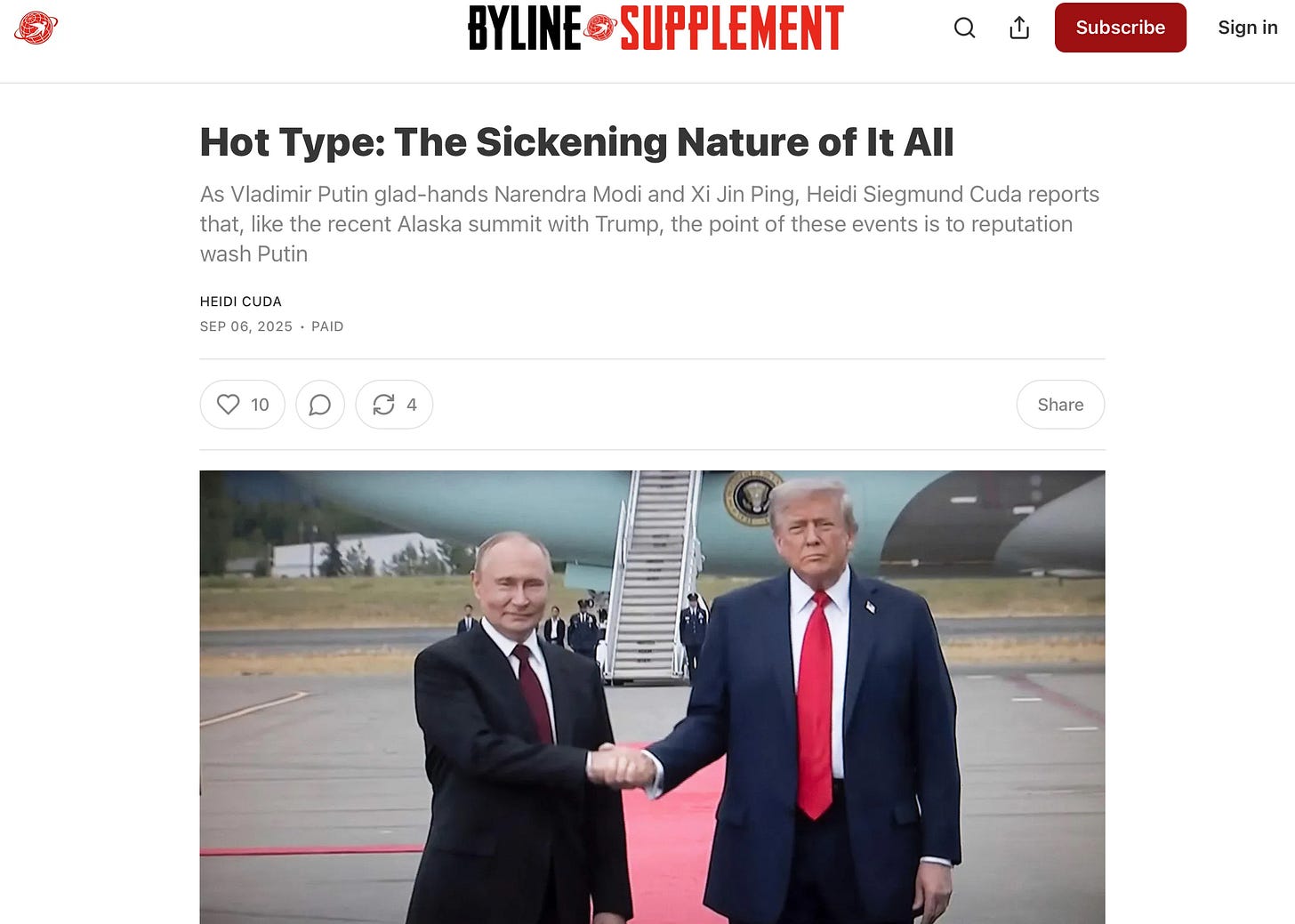 For this week’s Hot Type column in Byline, I write how the core objective of the Alaska Summit was to reputation wash Vladimir Putin. Plus, additional reporting from Michael MacKay and Monique Camarra