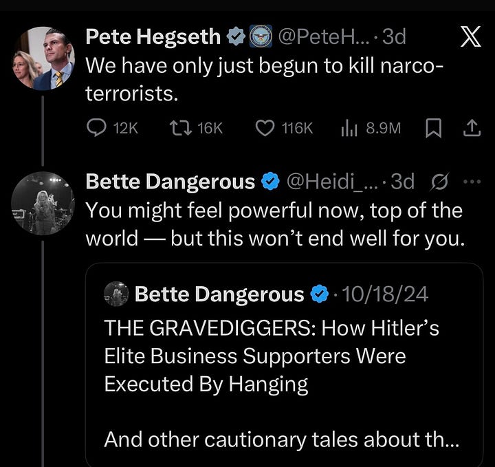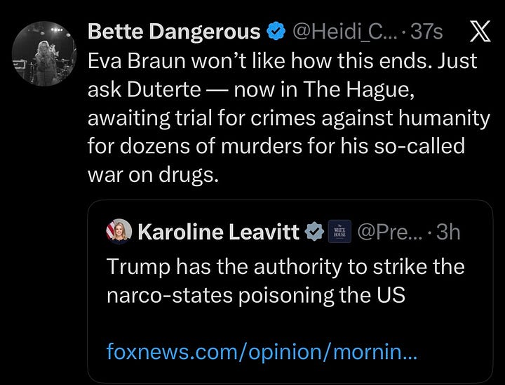 Trump, Hegseth, and Leavitt already qualify for crimes against humanity — 80 people have been murdered in their so-called war on drugs.