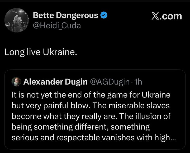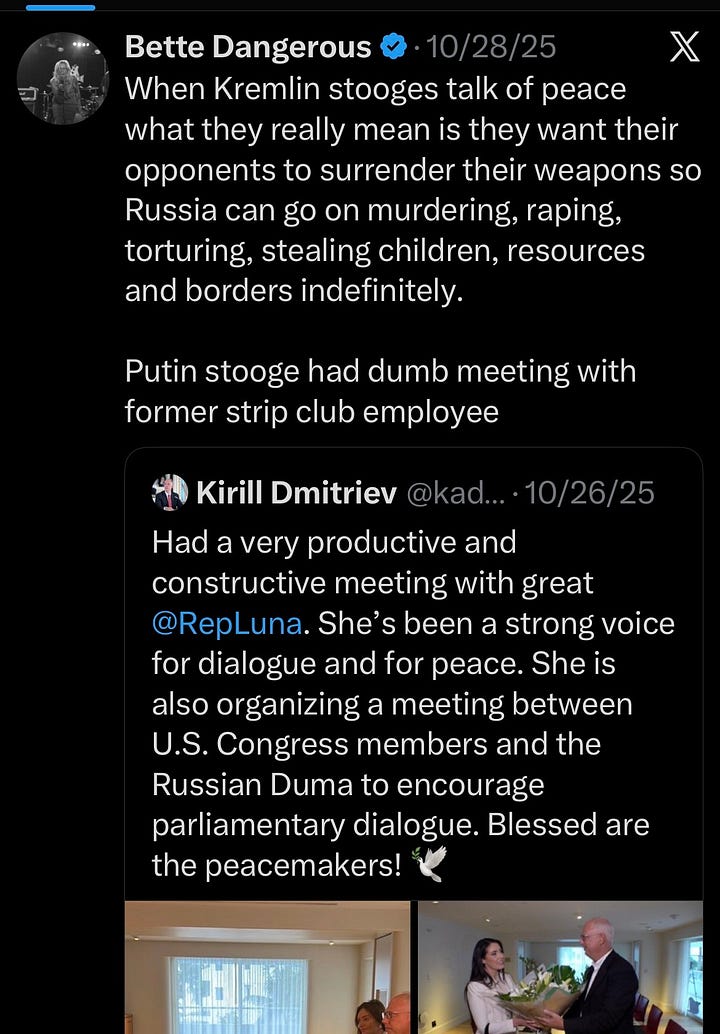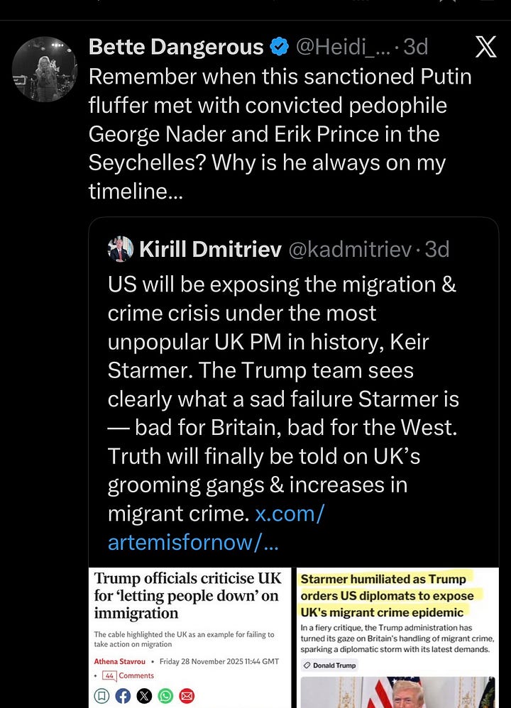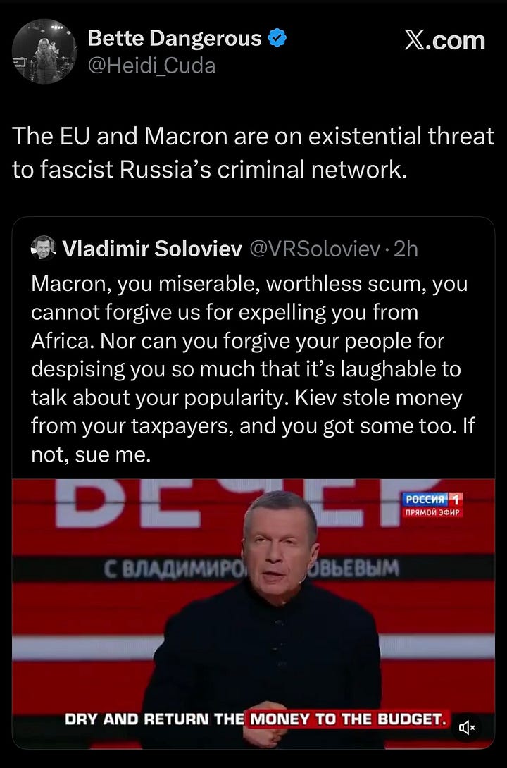 My Twitter For You feed is filled with Russian propagandists — not just US ones, posting selfies from the Pentagon or White House, but actual certifiable Russians. There’s Alexander Dugin, sh*tting from his mouth about Ukrainians, and Vladimir Soloviev dehumanizing Macron — a genuine threat to Russian fascists. And there’s Kirill Dmitriev pushing anti-UK garbage or fake peace plans.
