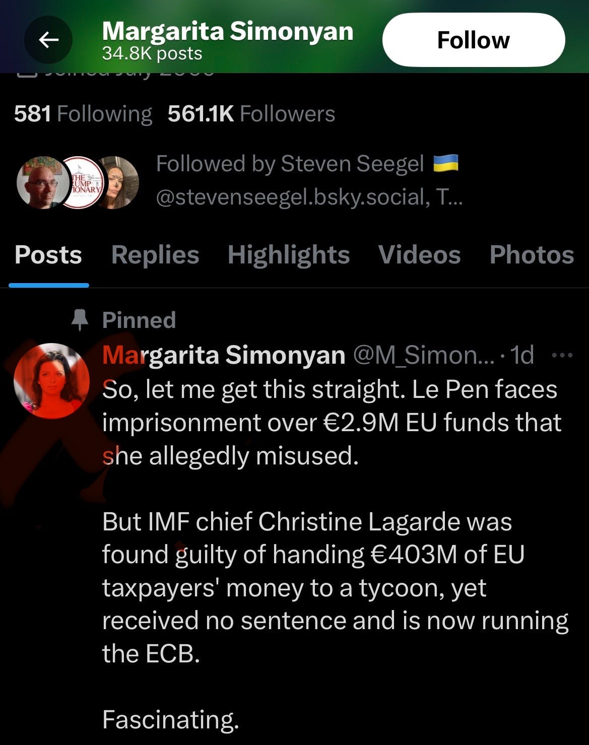 A Minister of Propaganda and Public Enlightenment of Russian State TV is dismayed that far-right leader Marine Le Pen was found guilty of embezzlement and barred from running for office. She tweeted out the following to her 600K followers: